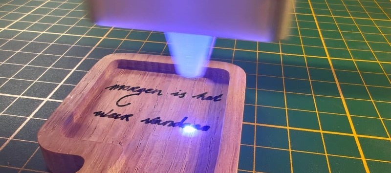 Na een schuurbewerking kon met behulp van een laser de persoonlijke boodschap op de onderzetter gebrand worden. Hiervoor werd een handgeschreven boodschap ingescand.