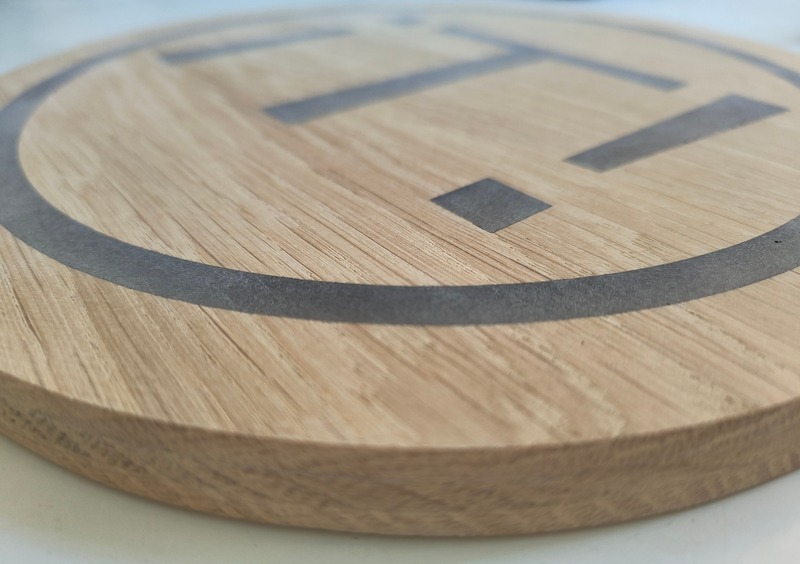 De basis van het ontwerp ligt ook hier weer in hergebruikt eikenhout dat gelaagd wordt toegepast waardoor de LED verlichting volledig onzichtbaar in het product verwerkt is. Het logo kan via een USB aansluiting gevoed worden, maar kan eventueel ook aangesloten worden op een powerbank waardoor bij haast overal te plaatsen is.
