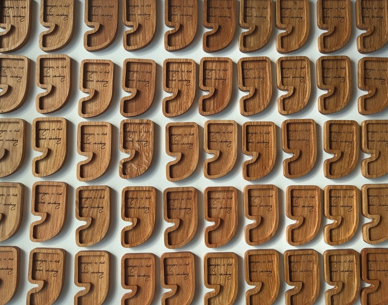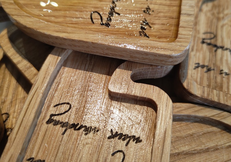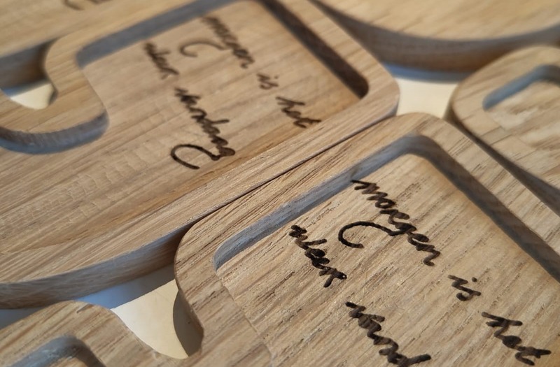 Na een schuurbewerking kon met behulp van een laser de persoonlijke boodschap op de onderzetter gebrand worden. Hiervoor werd een handgeschreven boodschap ingescand.