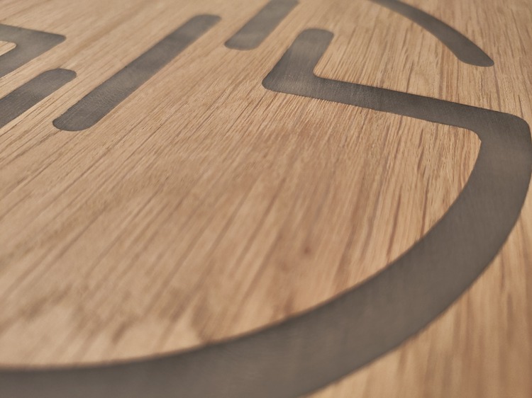 De basis van het ontwerp ligt ook hier weer in hergebruikt eikenhout dat gelaagd wordt toegepast waardoor de LED verlichting volledig onzichtbaar in het product verwerkt is. Het logo kan via een USB aansluiting gevoed worden, maar kan eventueel ook aangesloten worden op een powerbank waardoor bij haast overal te plaatsen is.